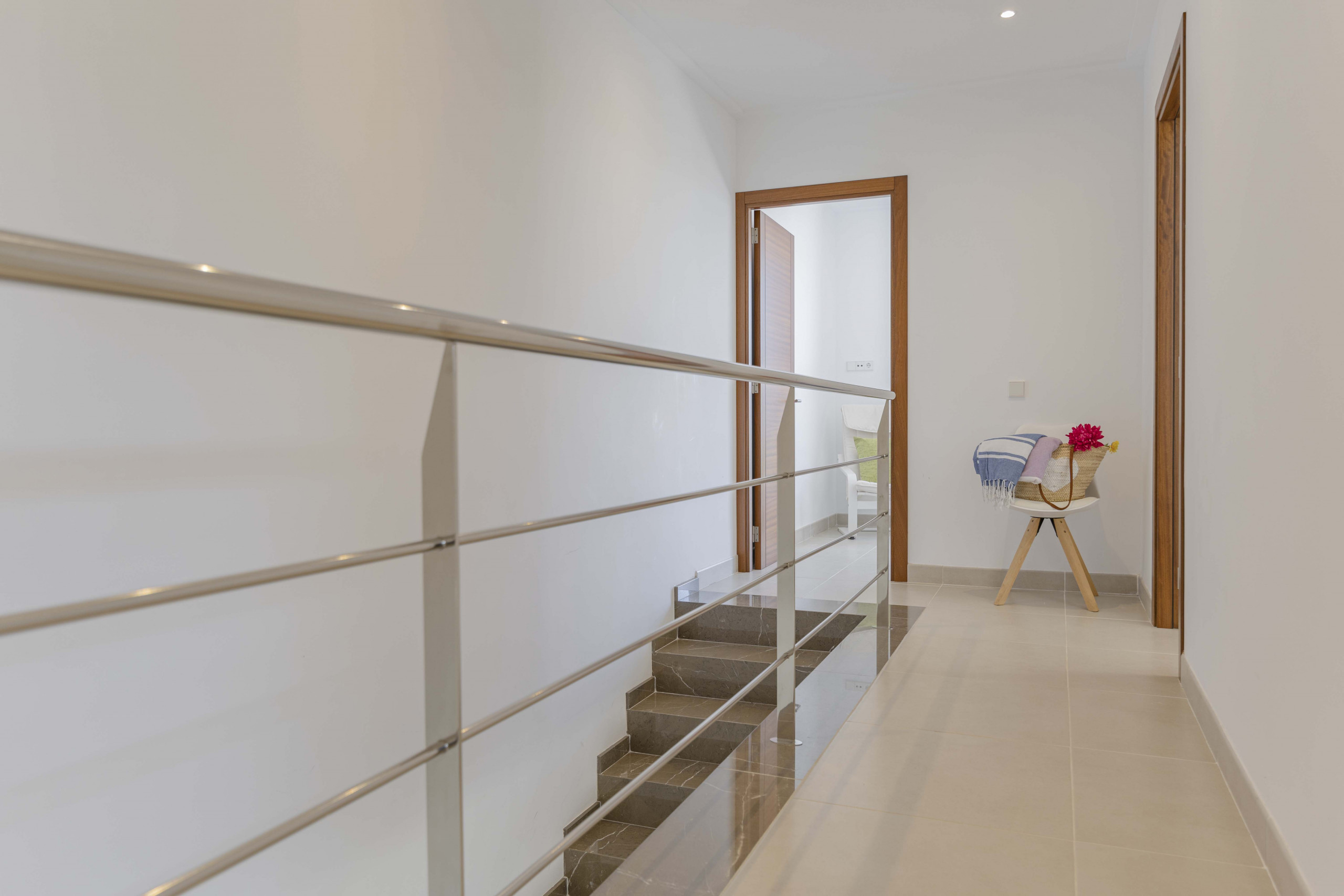 Next to the dining room, a flight of stairs lead to the upper floor of the house. There we find three double bedrooms, one with a double bed (150x190 cm) and two with two single beds (90x190 cm) in each one. One of the rooms has a complete bathroom with shower en suite. The other two upstairs bedrooms share a large complete bathroom with shower.